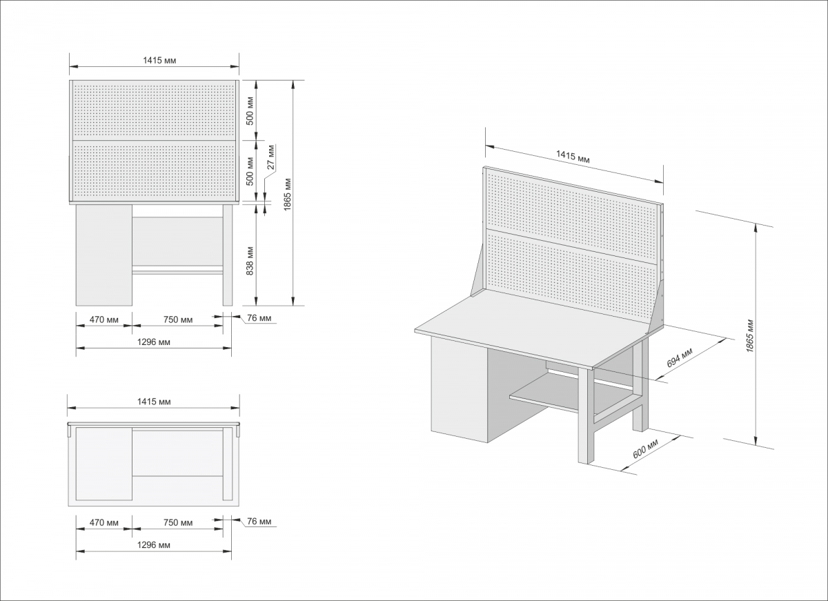 Усиленная столешница (1400х700х27мм) из МДФ и оцинкованного металла позволяет закрепить тиски и производить любые силовые работы по ремонту.