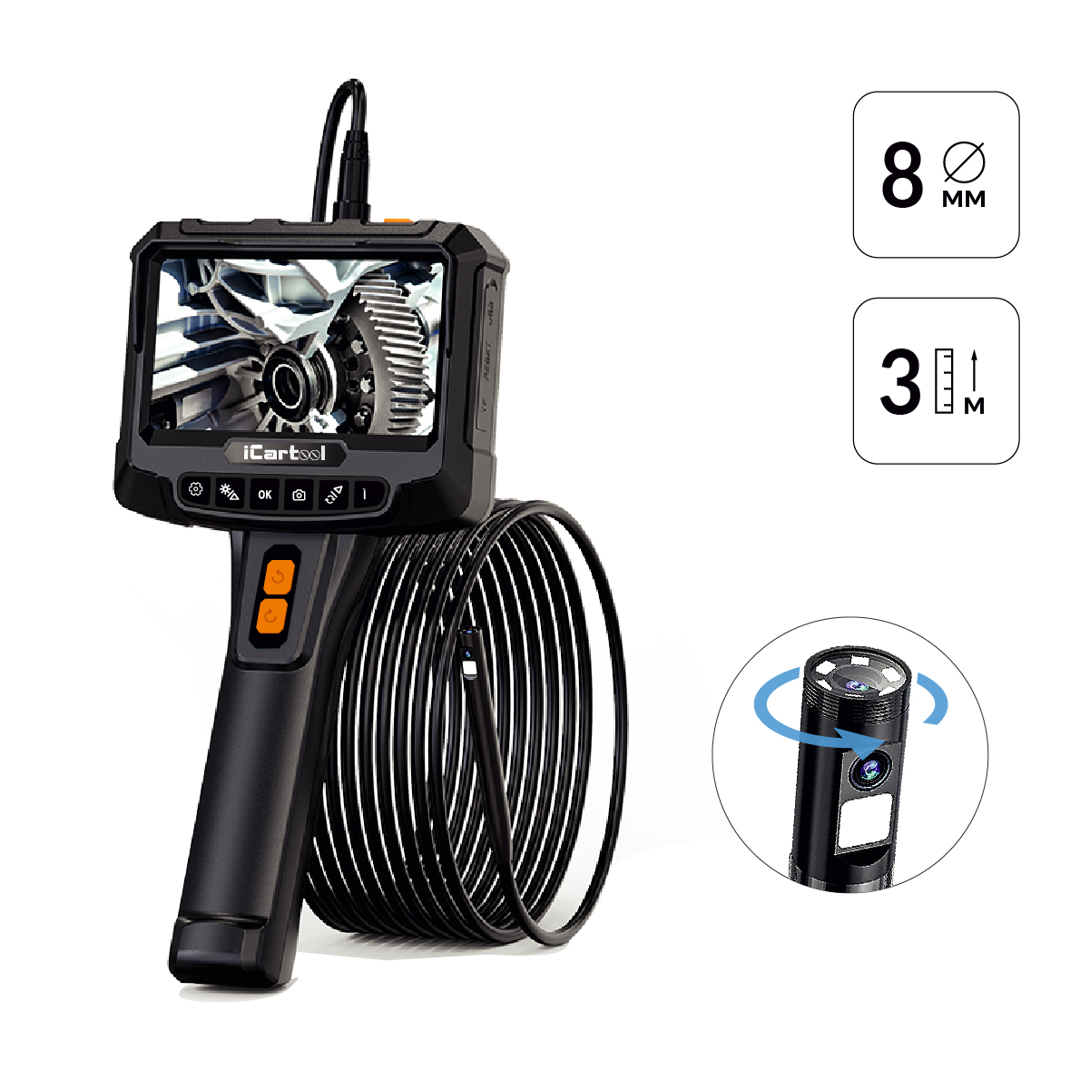 Видеоэндоскоп промышленный с вращением камеры, экран 5", 2 камеры 2Мп, 1920х1080, 3м, 8мм зонд, iCartool IC-VC700R-3