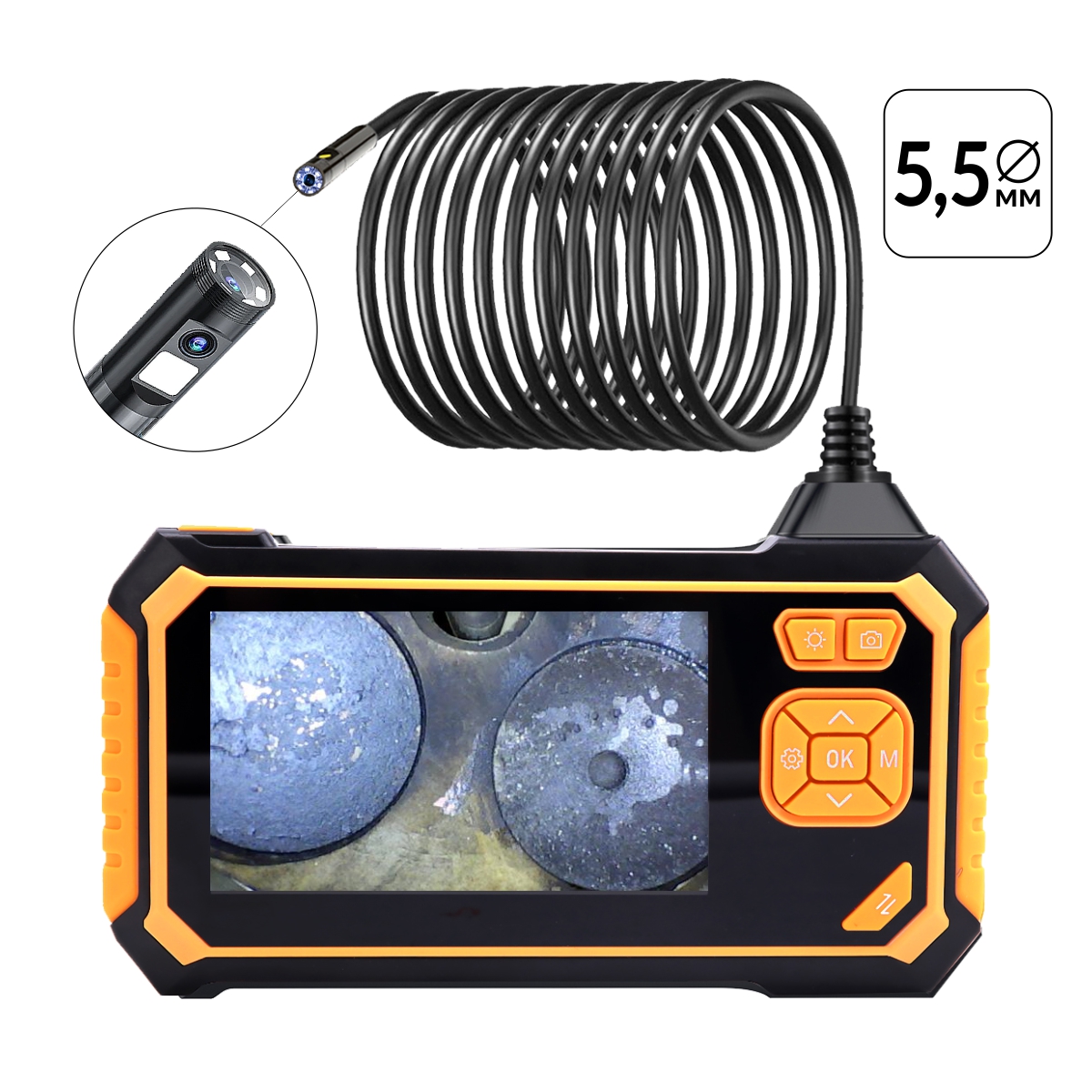 iCartool IC-V117 промышленный видеоэндоскоп в противоударном корпусе с двумя камерами и LCD экраном диагональю 4,3‘'. Вторая камера ориентирована на 90 градусов относительно основной. Это позволяет решить основную проблему специалистов СТО по контролю состояния впускных и выпускных клапанов ДВС. Наличие второй камеры дает возможность отказаться от использования эндоскопов c дорогостоящими управляемыми зондами. Обе камеры делают фото в разрешении Full HD 1920х1080, что позволяет выявить мельчайшие повреждения исследуемых узлов и поверхностей. Время работы до 3х часов от одной зарядки. Зонд, диаметром 5.5 мм и длиной 3 м имеет влаго и пылезащиту IP67. В комплект входят 3 насадки. Насадки крепятся к зонду при помощи резьбового крепления, что позволяет избежать падения насадок с зонда и расширяет возможности видеоэндоскопа (крючок для работы с электропроводкой, магнит для извлечения металлических предметов из труднодоступных мест). Особенности видеоэндоскопа IC-V117 Две камеры - фронтальная и боковая, ориентированная под углом 90° Зонд полужесткий, с эффектом памяти формы, диаметром 5.5 мм Цветной LCD дисплей 4,3‘' имеет угол обзора 360° Фокусное расстояние фронтальной камеры от 2 до 10 см Фокусное расстояние боковой камеры от 2 до 5 см Широкий угол обзора камеры 78° LED подсветка из 6+1 светодиод с 3-мя режимами яркости Поворот изображения на экране, цифровой зум Встроенный аккумулятор объемом 2600 мАч позволяет непрерывно работать до 3х часов Для сохранения полученных результатов используется TF карта памяти (опция) Преимущества видеоэндоскоп IC-V117 Меню на русском языке Высокое разрешение снимков и видео позволяет просматривать их даже на большом экране Легкий эргономичный корпус с прорезиненными боковыми вставками удобно располагается в руке Объектив имеет защиту IP67 - гарантирует надежность и долгий срок службы Широкий спектр применения благодаря уникальным техническим характеристикам: В автосервисе для инспектирования различных узлов автомобиля (кузовной ремонт, диагностика цилиндров поршневой группы двигателя, диагностика систем кондиционирования и многое другое) В промышленности для инспектирования машинного оборудования и производственных линий для объектов ЖКХ при инспектировании вентиляций, механизмов без разборки и т.п. Технические характеристики Кол-во камер: 2 Диаметр зонда: 5.5 мм Длина зонда: 3 м Тип зонда: Несъемный Тип камеры: CMOS Разрешение камеры: Основная 2 Мп Боковая 2 Мп Разрешение изображения: Основная камера 1920х1080 Боковая камера 1920х1080 Разрешение видео: Основная камера 1280x720 Боковая камера 1280x720 Размер экрана: 4,3‘' LCD Поворот экрана: Да Цифровой зум: Да Угол обзора: 78° Фокусное расстояние: от 2 до 10 см Фокусное расстояние боковой камеры: от 2 до 5 см Подсветка камеры: 8+1 белых светодиодов, 3 режима яркости Степень защиты: IP67 Формат изображения: JPEG Формат видео: AVI Меню: на русском языке Поддержка карт памяти: micro TF (Transflash) до 64 гб Аккумулятор: 2600 мАч Время работы: до 3 часов Зарядка: USB, до 2.5 часов Рабочая температура: От -10 °C до + 50 °C Комплектация Видеоэндоскоп IC-V117 Магнит Защитный колпачок Крючок Кабель для зарядки USB-MicroUSB Инструкция пользователя Чехол для переноски и хранения