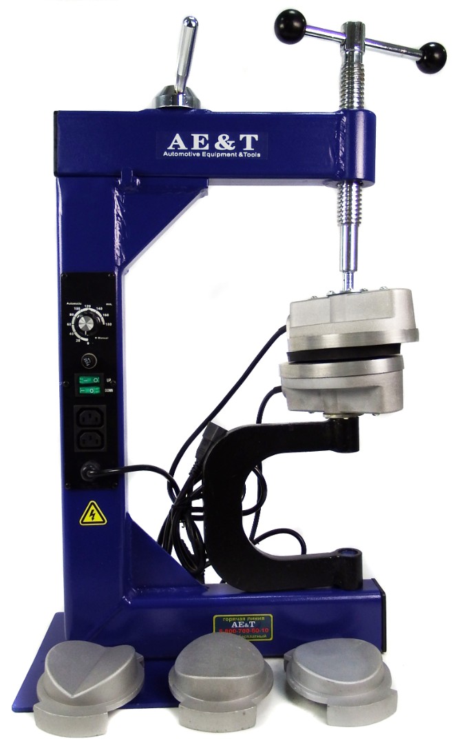 Прибор оснащен ручным винтовым прижимом для фиксации покрышки и регулятором температуры вулканизации.