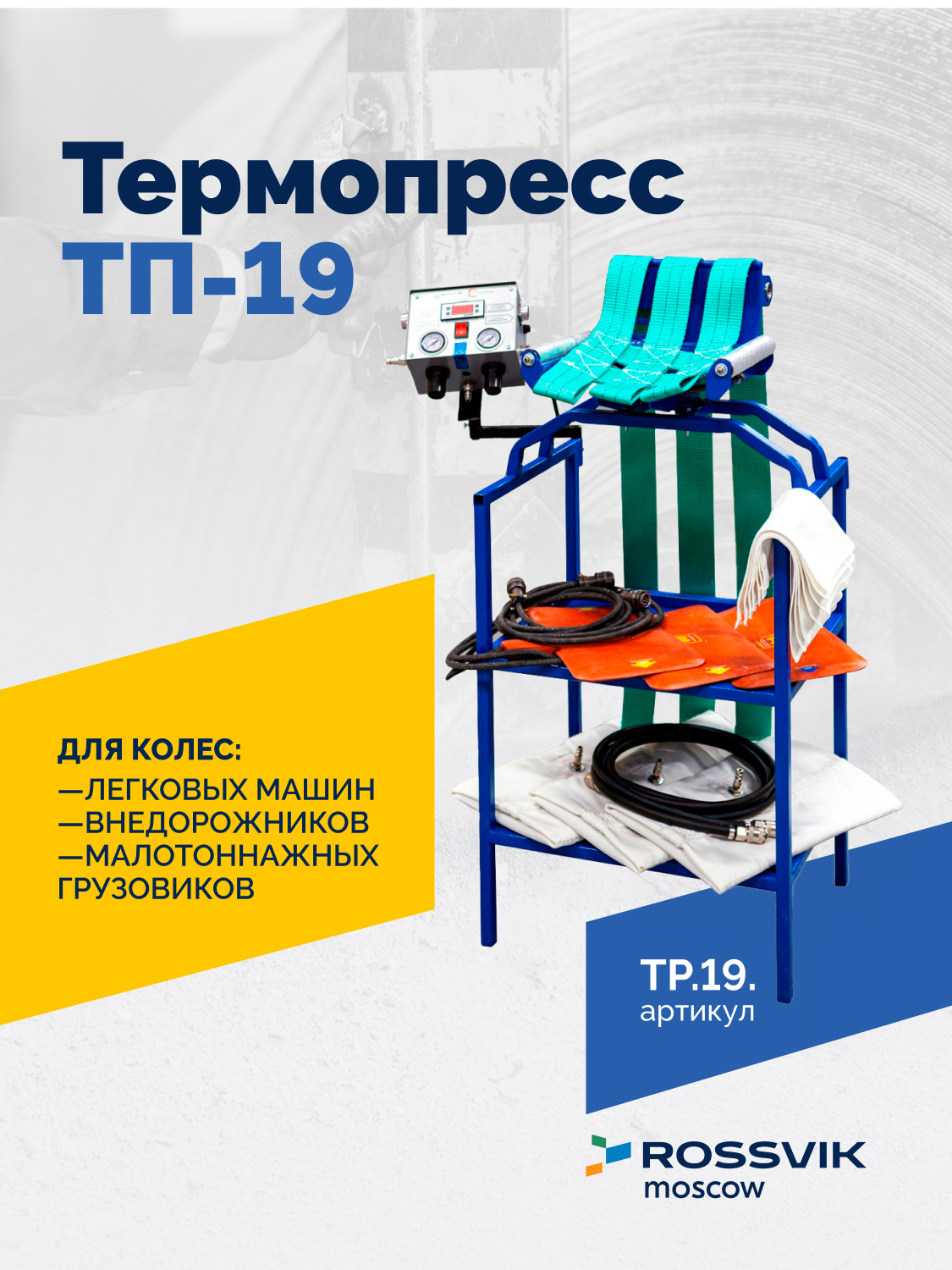 ТП-19 предназначен для ремонта шин легковых автомобилей и малотоннажных грузовиков. Координация работы вулканизатора происходит через модернизированный пульт управления. Установка в пульте нового микропроцессора позволило отслеживать и контролировать температуру нагрева обоих электронагревательных матов (наружного и внутреннего).