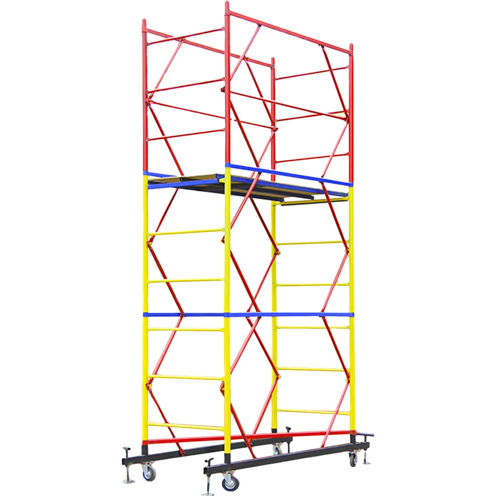 Вышка-тура Gigant 0,7x1,6м H=4м GTT-006 - универсальная передвижная модель для строительных, ремонтных, монтажных работ как внутри помещения, так и для уличных работ. За счет ширины базового блока на ней комфортно работать сразу нескольким людям, разместив весь необходимый инструмент и материалы. Легко собирается без необходимости использования специального инструмента (все элементы соединяются флажковыми механизмами). Ее просто перемещать по объекту за счет наличия больших прорезиненных колес, которые также снабжены фиксаторами положения. Вышка тура ВСП изготавливается из электросварной трубы диаметром 42 мм. Все детали окрашиваются по технологии порошковой окраски, в итоге получается покрытие с высокими защитными и декоративными свойствами. Настил изготовлен из фанеры толщиной 10 мм, состоит из трех независимых частей, в одной из которых есть люк для безопасного и удобного перемещения для проведения работ. Также настилы можно размещать на разных уровнях вышки для одновременных работ, соблюдая технику безопасности. Помните, вышка выдерживает общий вес до 250 кг. ВАЖНО: При высоте вышки более 5 метров рекомендуем использовать комплект стабилизаторов для обеспечения лучшей устойчивости и безопасности проводимых на вышке работ. В процессе транспортировки вышка может получить визуальные потертости, царапины и прочее, что никак не влияет на ее эксплуатационные характеристики и не признается браком.