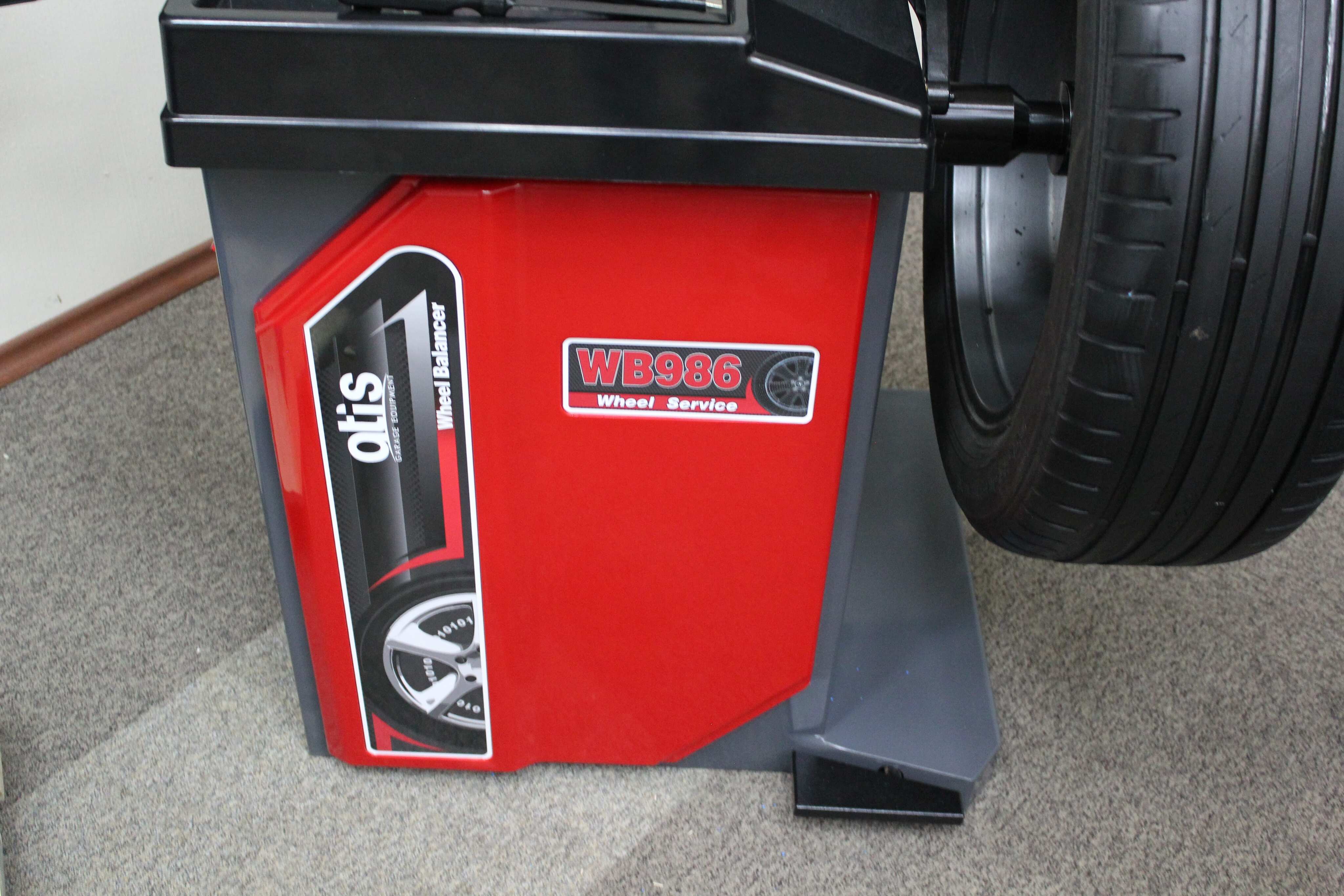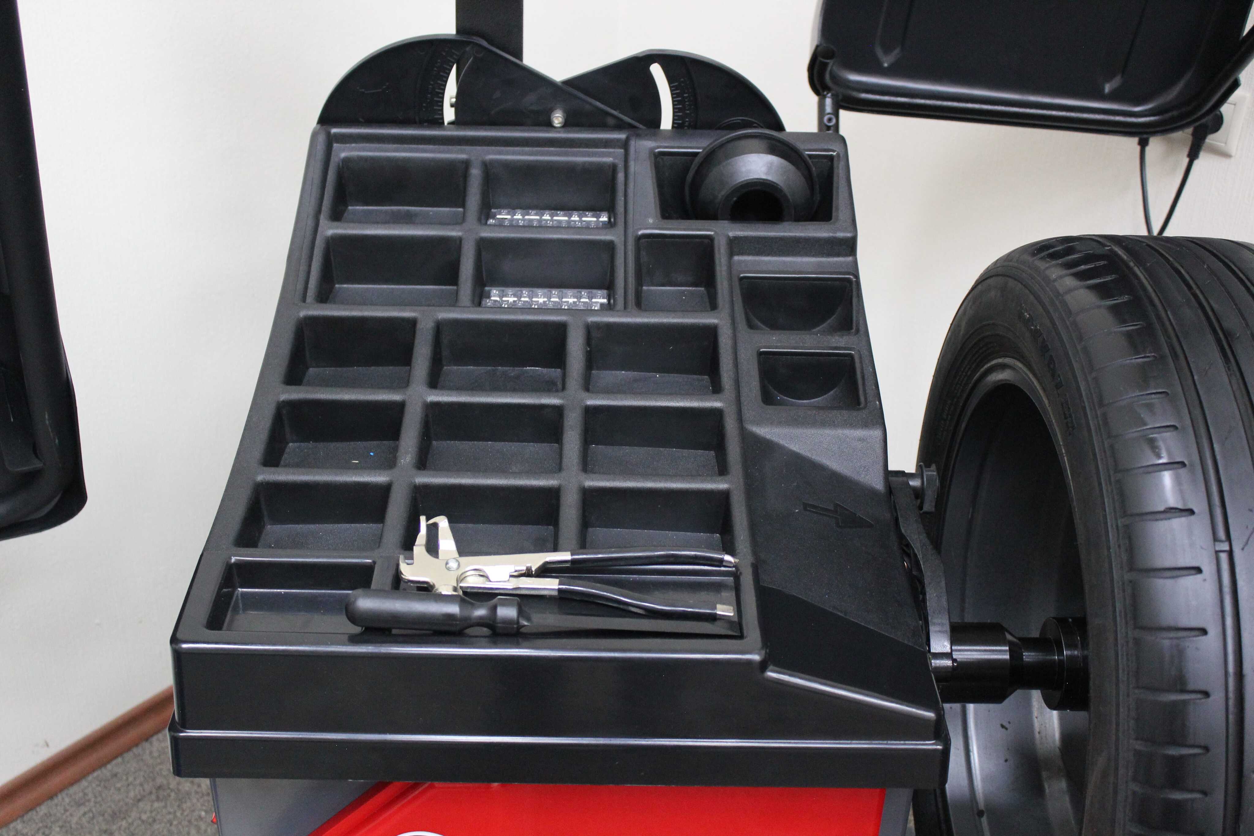 - Станок оснащен педалью фиксации колеса, что упрощает процесс установки грузика;
