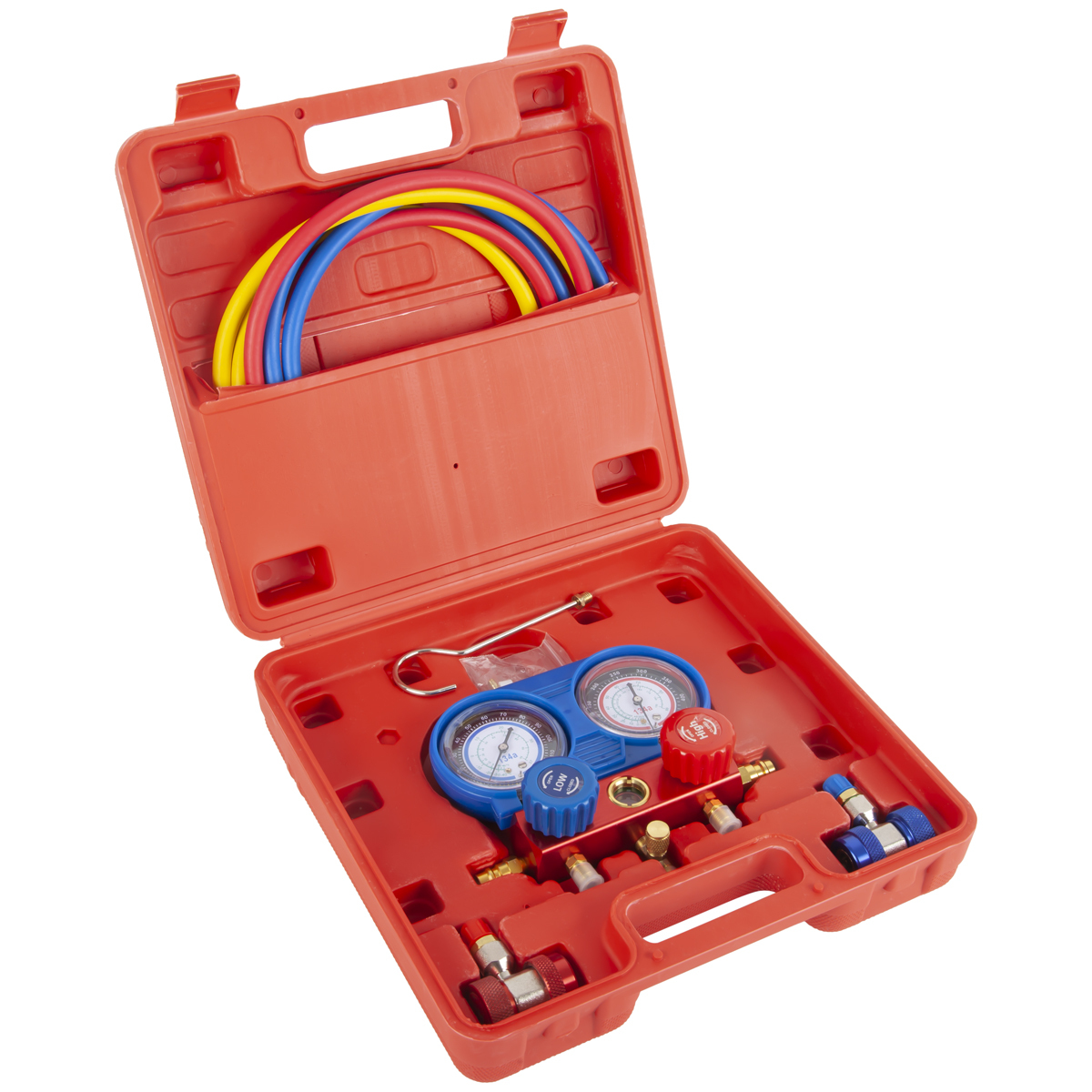 Коллектор манометрический WDK-214079 представляет собой два манометра (для измерения давления в каждом из контуров кондиционера), комплект штуцеров с вентилями и три специальных шланга. К штуцерам подключаются шланги для заправки хладагента или проверки давления, а вентили обеспечивают герметичность контуров и простую регулировку подачи хладагента.