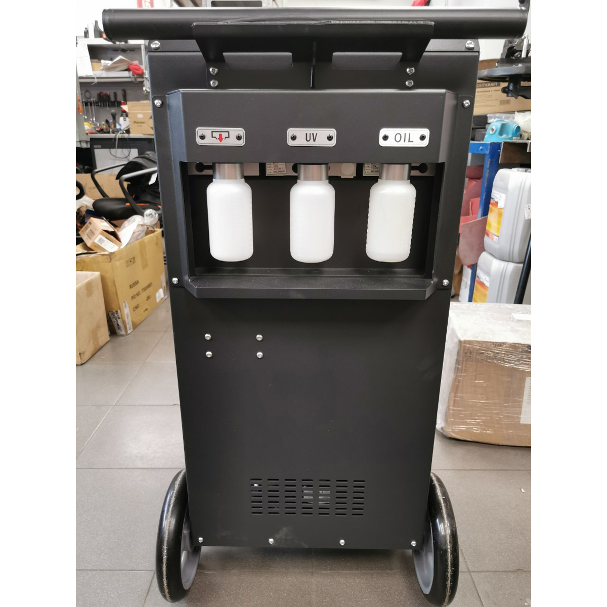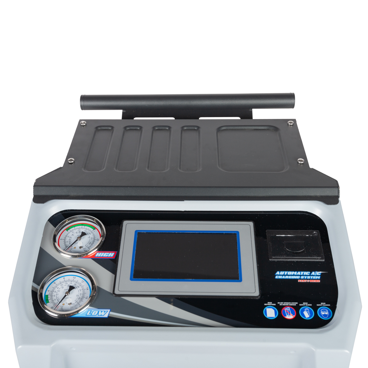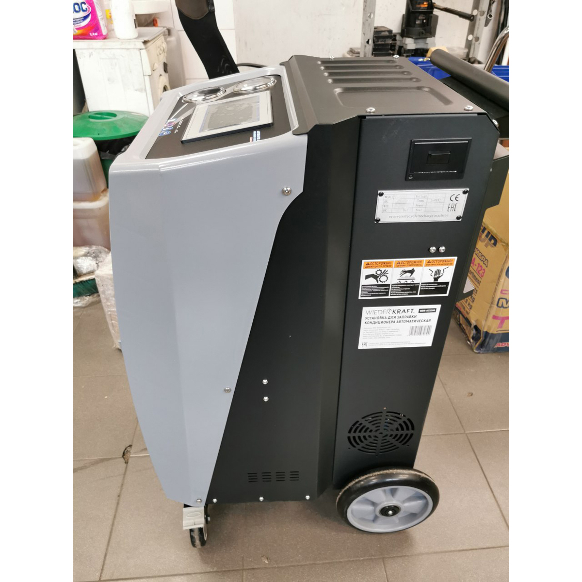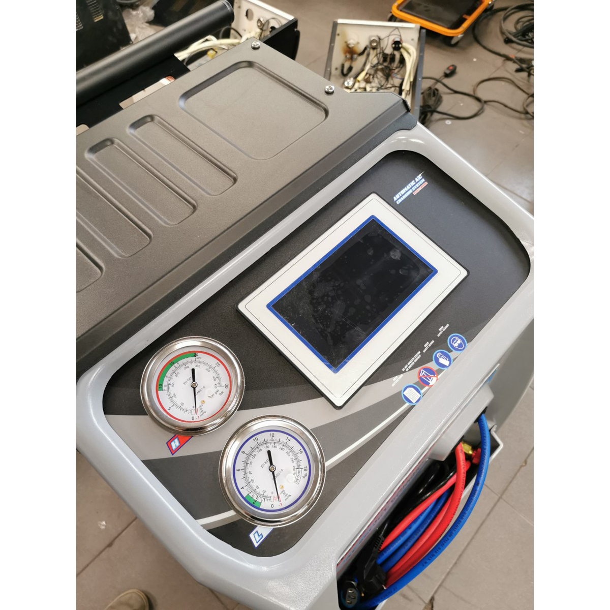 Автоматическая установка для обслуживания автомобильных кондиционеров AC2000. Металлический корпус с пластиковой передней панелью оснащен большими колесами в задней части и поворотными колесами в передней части. Панель управления с сенсорным дисплеем TOUCH HQ диагональю 8 дюймов и интуитивно понятным графическим интерфейсом управления делают работу оператора простой и понятной.