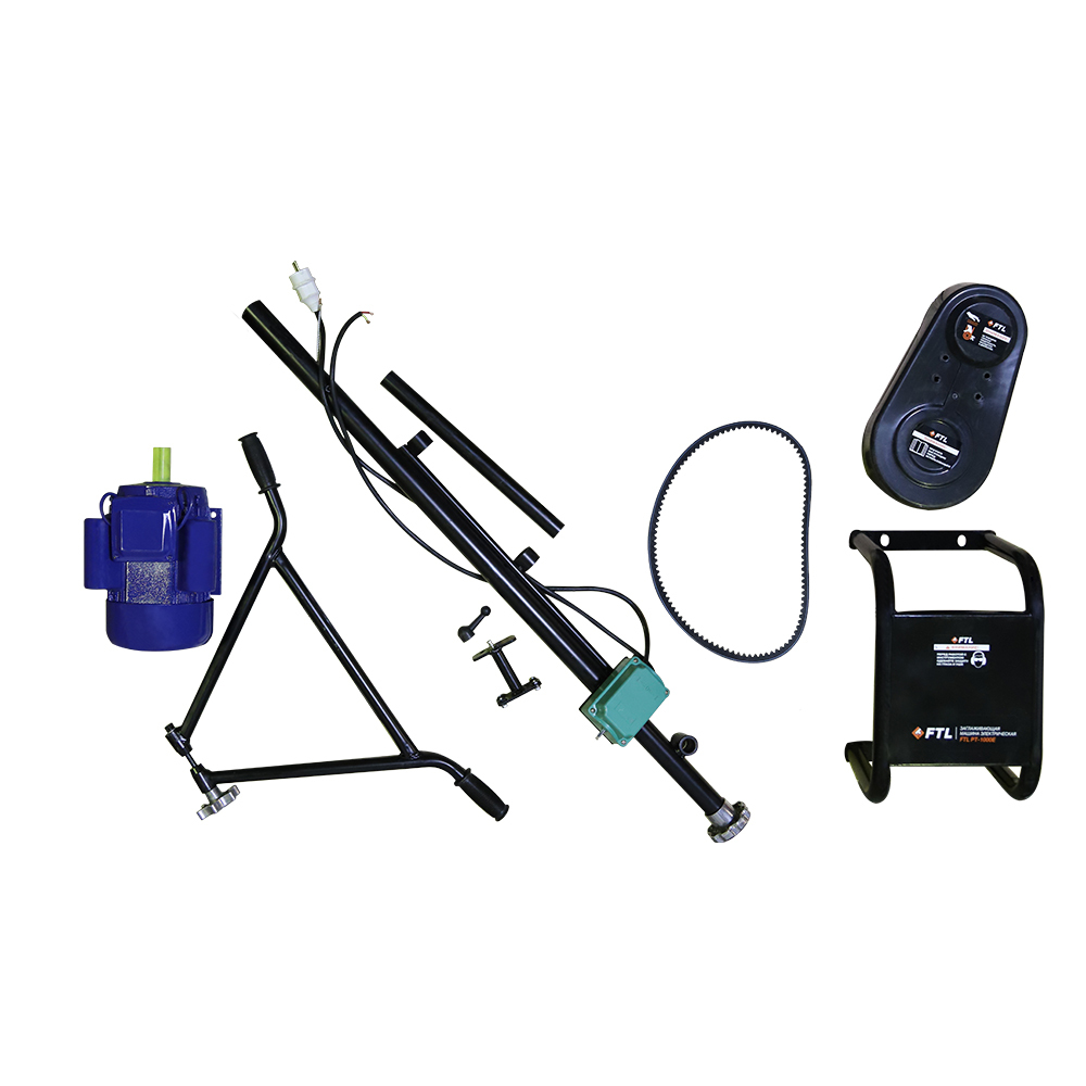 Затирочная машина электрическая FTL PT-1000E - профессиональный инструмент, предназначенный для выравнивания стяжки, заглаживания, затирки и окончательной отделки бетонных поверхностей на завершающих стадиях устройства бетонных полов в строительстве. Выходной вал электродвигателя через ременную передачу вращает ось затирочного привода, оснащенного лопастями или диском. Оператор направляет её с помощью рукоятки (водила) в нужную сторону. Данная модель оснащена мощным индукционным однофазным (230 В / 50 Гц) электрическим двигателем 2,2 кВт который способен осуществлять вращение затирочного привода диаметром 1000 мм со скоростью 130 об/мин. Главное преимущество от использования электродвигателя заключается в отсутствии вредных выхлопов в процессе работы, что позволяет работать в закрытых помещениях в условиях недостаточной вентиляции, а также существенно меньшем уровне шума, благодаря чему машину можно использовать в вечернее время суток. Рабочий диаметр в 1000 мм делает ее наиболее высокопроизводительной в своем классе и подходящей для обработки больших площадей. Затирочный привод машины оснащается четырьмя лопастями для затирки размером 343 х 150 мм которые имеют регулировку угла лопастей для различных стадий заглаживания и состояний бетона, также возможна установка диска 1000 мм для грубой затирки. Крепкая металлическая рама по периметру привода защищает лопасти от повреждения в случае столкновения со стенами и углами. Дополнительный комфорт обеспечивают прорезиненные рукоятки для виброгашения. Для удобства перемещения машины от одного рабочего участка к другому, в условиях строительной площадки, предусмотрен кронштейн для транспортировки с помощью крана. Вес затирочной машины в собранном состоянии составляет 94 кг.