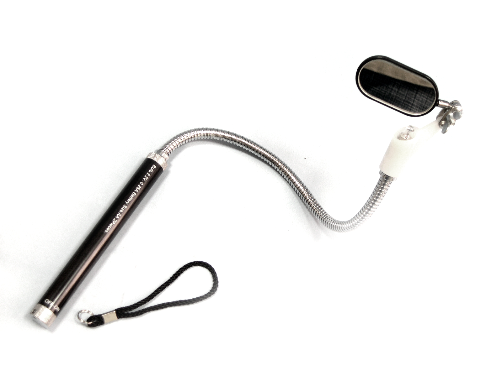 KA-5204 зеркало на гибкой ручке с фонариком 500 мм Используется для осмотра труднодоступных затененных мест. Зеркало овальное 25х50мм Длина 500мм Питание 1,5V АА — 2 шт