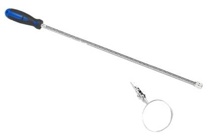 KA-5229 Зеркало на гибкой ручке 580мм + магнит. Особенности: Гибкая конструкция позволяет использовать инструмент в труднодоступных местах. Ниша для хранения магнитной насадки в рукоятке. Зажим для фиксации зеркала в разных положениях. Комплектность: Зеркало на гибкой ручке с магнитом - 1 шт. Блистерная упаковка - 1 шт.